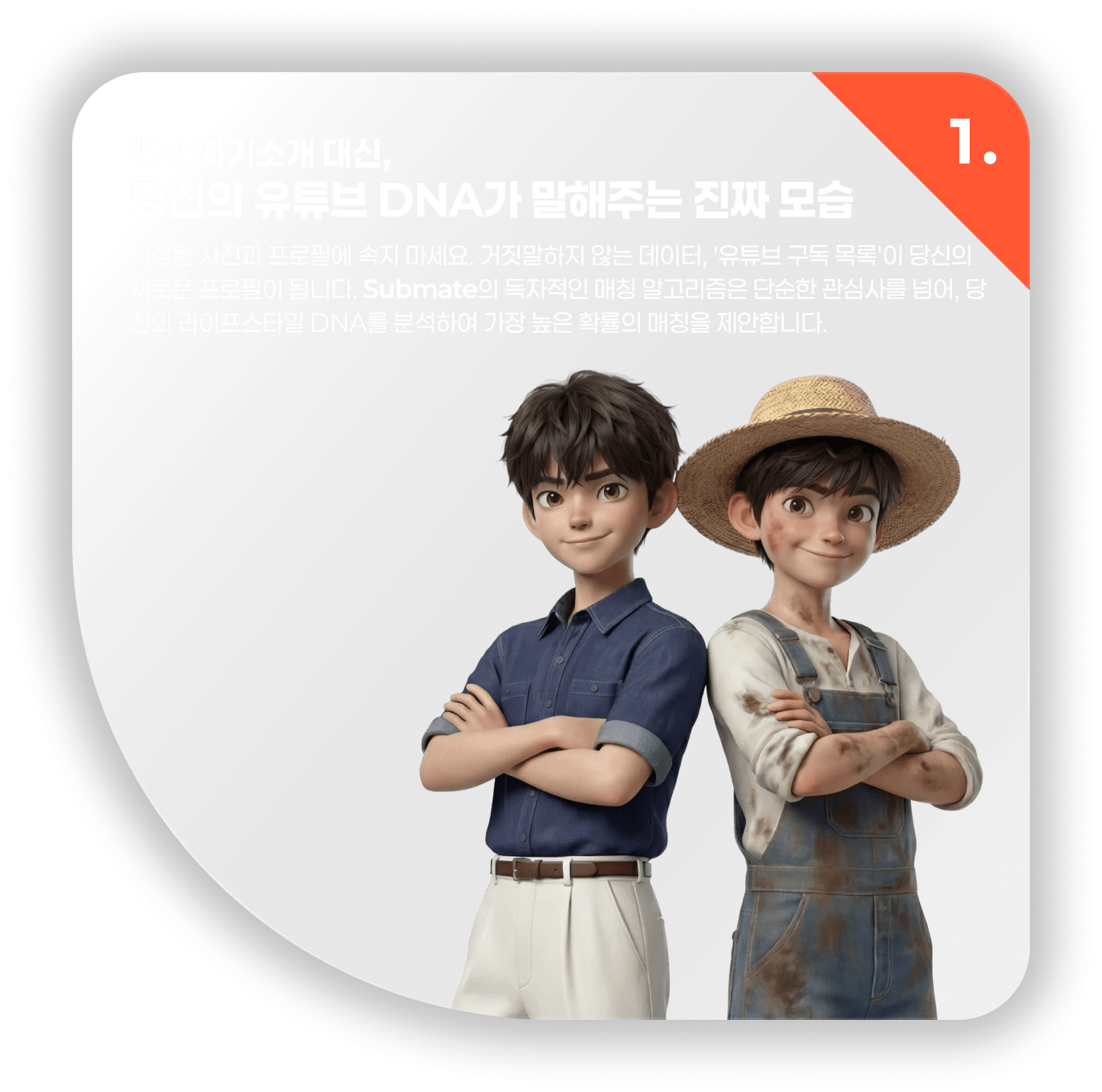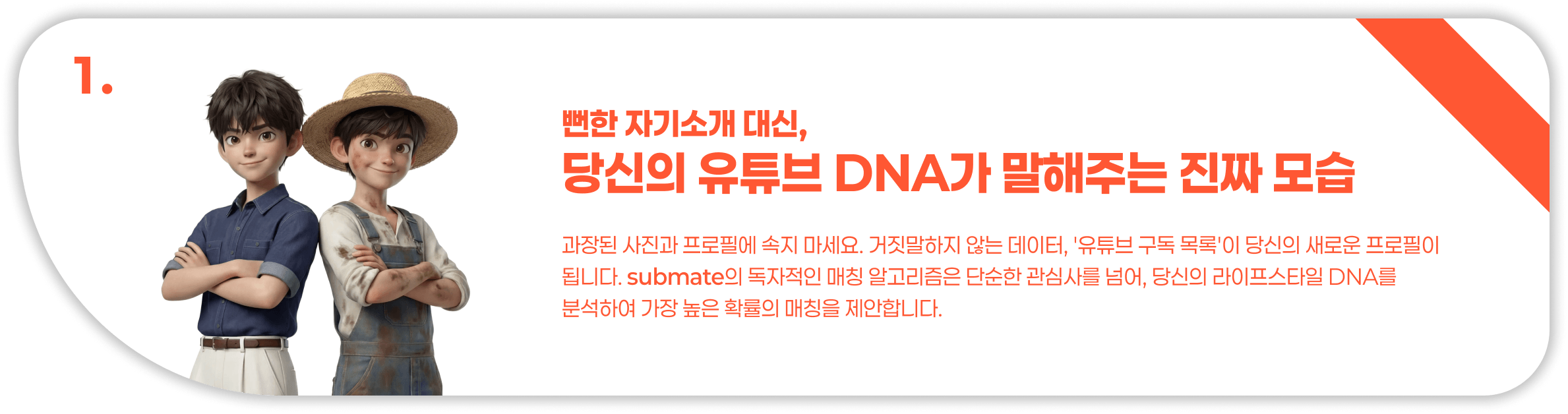 더 이상 지친 감정 소모와 가짜 프로필에 속지 마세요.Submate는 '알고리즘'이 당신의 인연을 찾습니다.