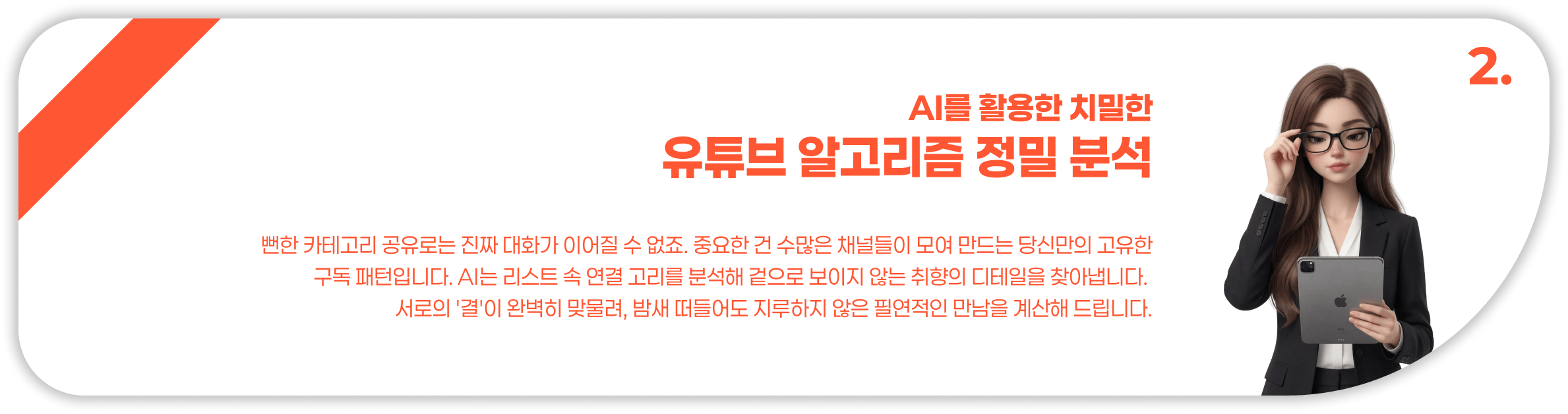 당신은 무의미하게 흘러가는 알고리즘의 늪을 거부하고, 철저히 성장과 영감을 주는 콘텐츠만을 취사선택하는 프로 자기계발러입니다. 멍하니 쇼츠를 넘기는 대신 아침엔 동기부여 영상을, 퇴근 후엔 재테크나 직무 관련 인사이트 채널을 시청하며 하루의 밀도를 높이는 데 집중합니다.